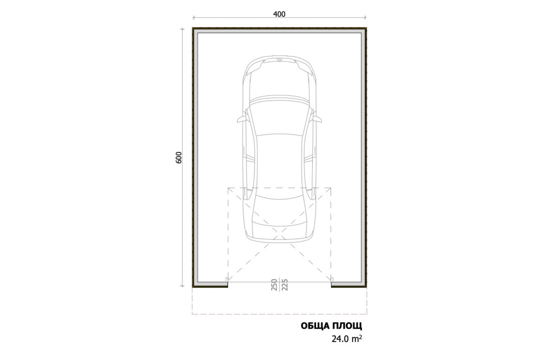 Kонструкция за гараж с размери 4 метра ширина и 6 метра дължина, с обща площ 24 квадратни метра. Изработена от студено огънати C-образни профили.