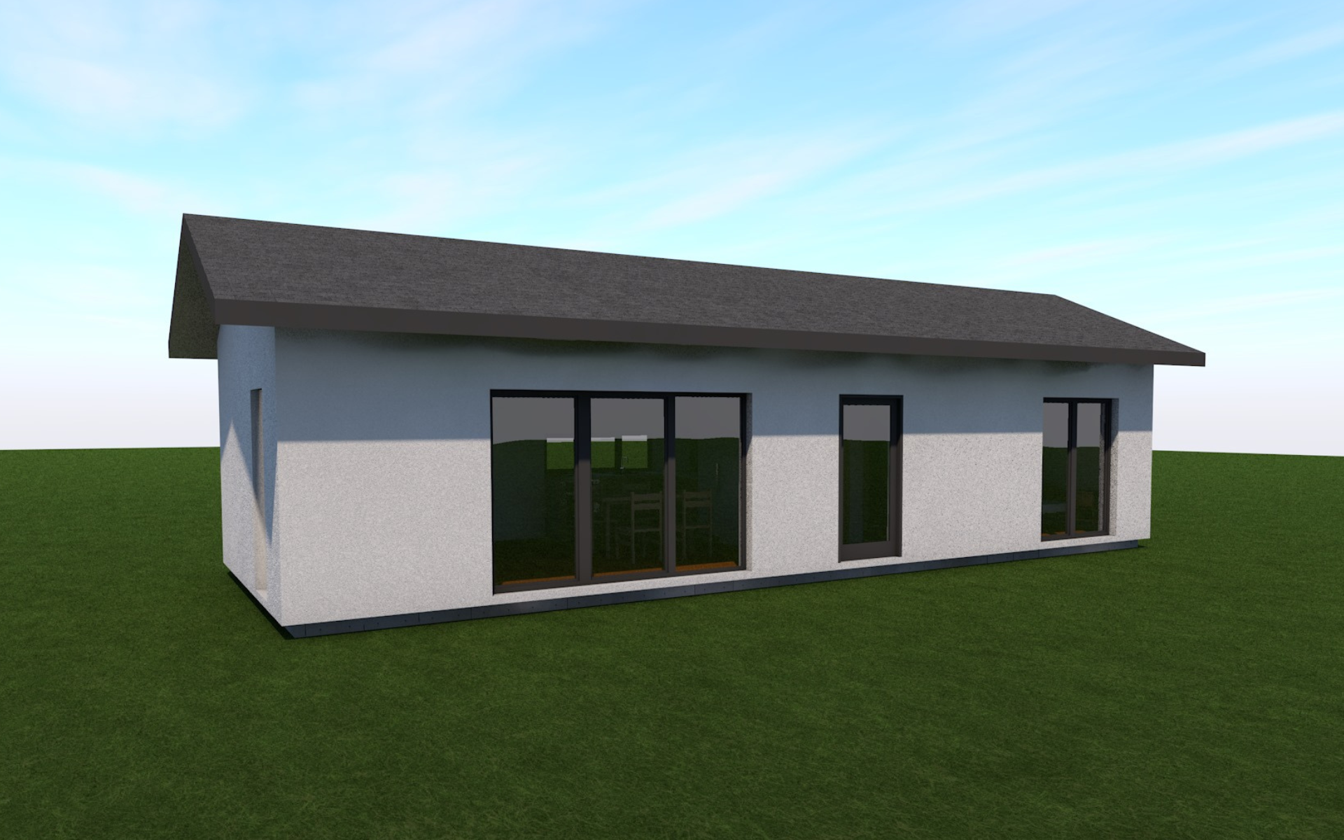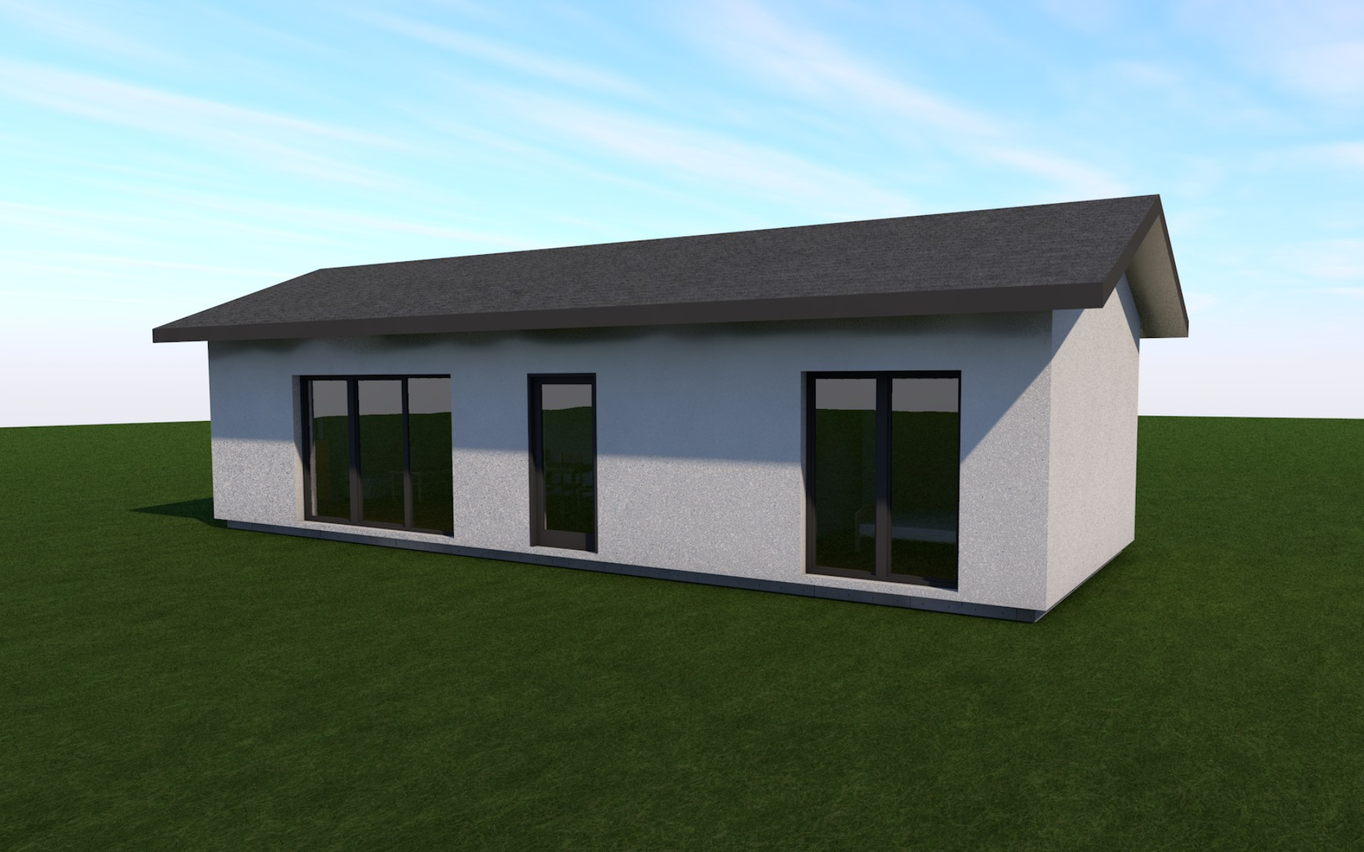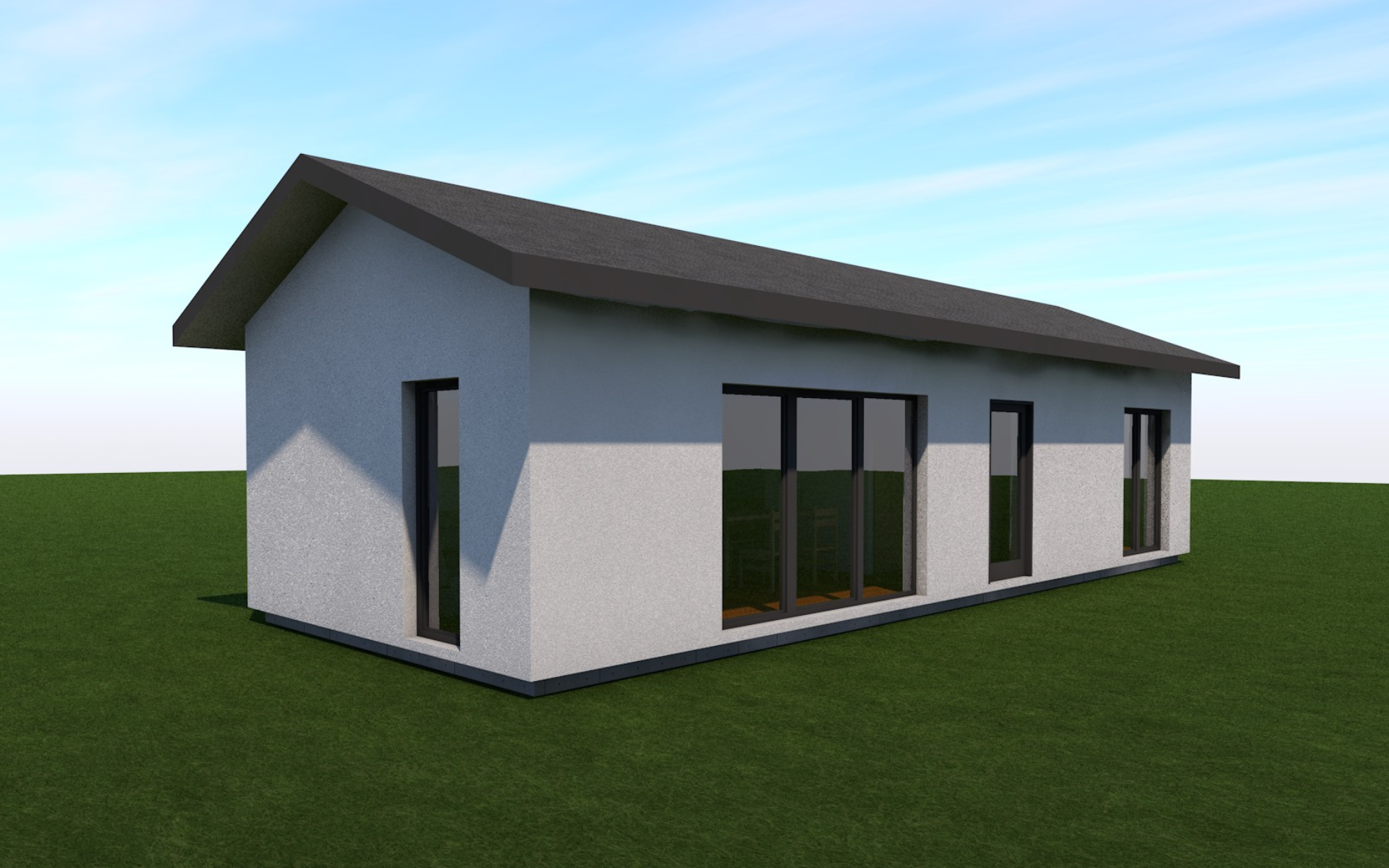 Kонструкция за къща с размери 4.6 метра ширина и 12 метра дължина, с обща площ 55 квадратни метра. Изработена от студено огънати C-образни профили.