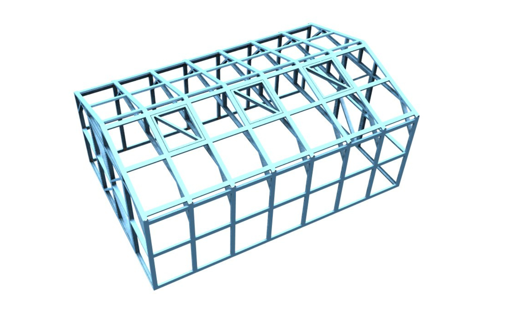 Kонструкция за оранжерия с размери 6 метра ширина и 4 метра дължина, с обща площ 24 квадратни метра. Изработена от студено огънати C-образни профили.